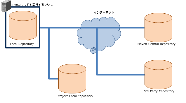| Local Repository | mvnコマンド[1]を実行するマシン上に自動的に作られるリポジトリ。 他のリポジトリから取得したjarをキャッシュするのが主な役割である。 |