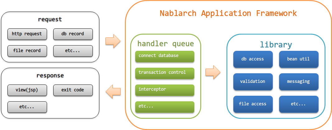 Nablarchは受け取ったリクエストに対し、ハンドラキュー上に定義されたハンドラを先頭から順に処理を実行する。 リクエストに対するハンドラの処理内でレスポンスが返却された場合、レスポンスに対しこれまでに実行されたハンドラを逆順に実行する。